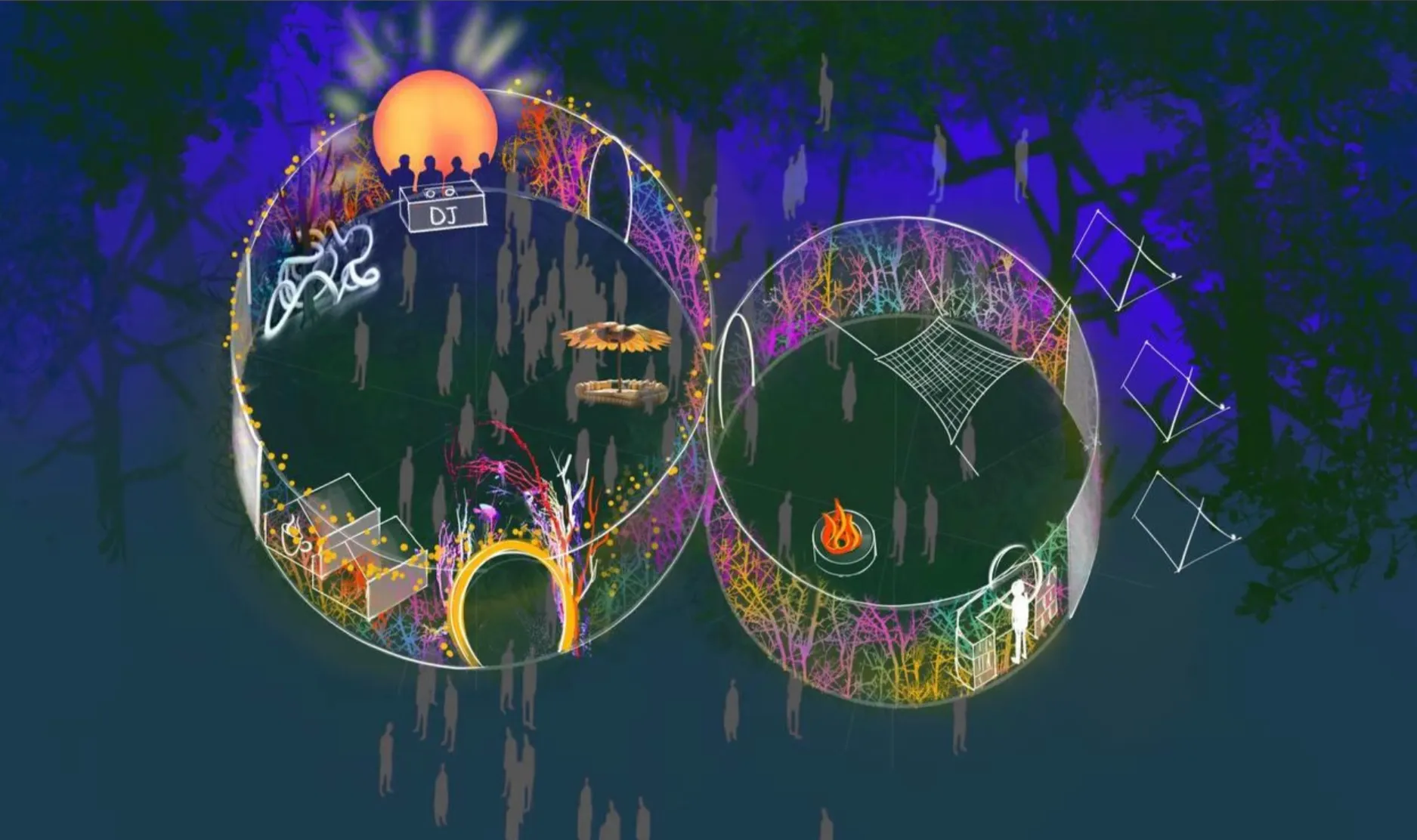 Портал в сингулярность, где огонь, свет и зеркала создают уютную альтернативную реальность. Вечером — релакс у “живых” растений с фоновой музыкой, ночью — огненные шоу в геосфере и зеркальные порталы, меняющие отражения. А еще шанс отправить себе “письмо из прошлого” через сервис “Флэшбэк с рейва”