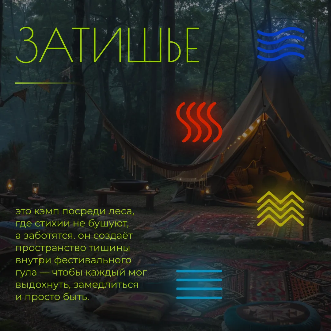 Кэмп для тех, кто хочет быть во время фестиваля в ресурсе. Восполнить его позволят беседы у костра, горячие напитки в чайной и безмятежный отдых в чилл-зоне. Гости приглашаются на медитативные практики, кинопоказы, поэтические вечера, музыку